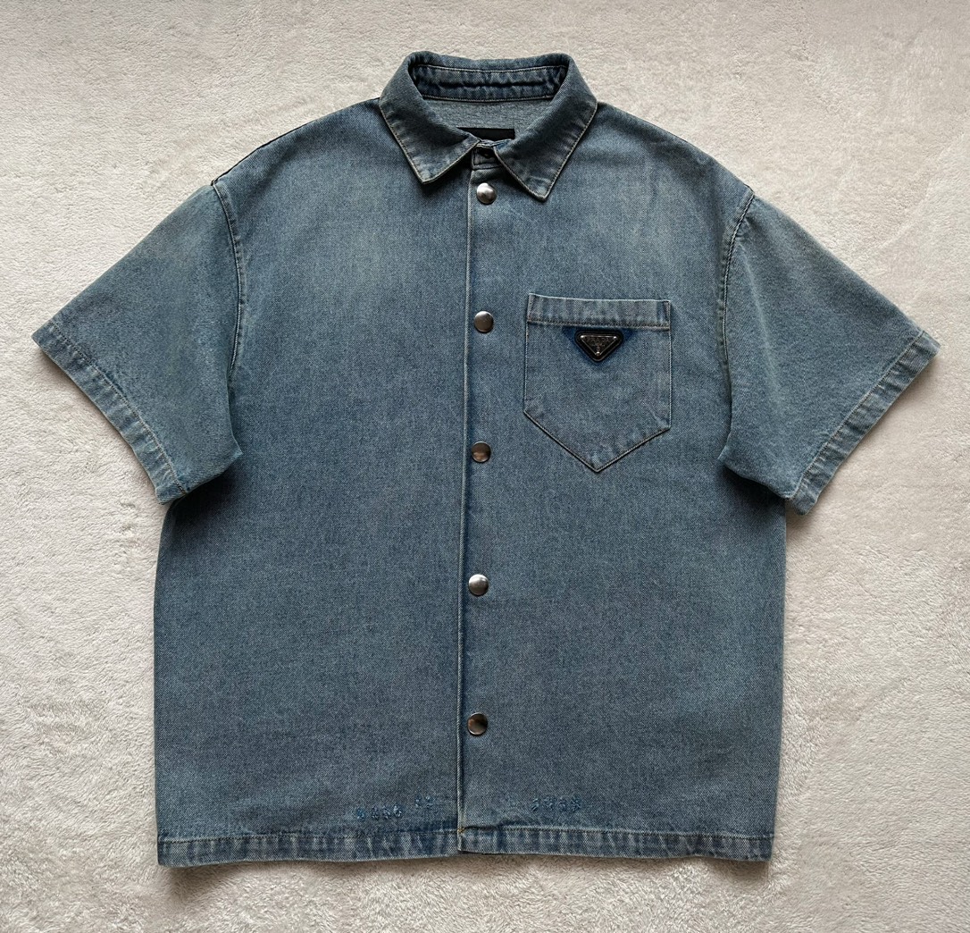 Prada Triangle Iron Brand Single breasted Washed Light Blue Denim Short Sleeve Shirt Coat