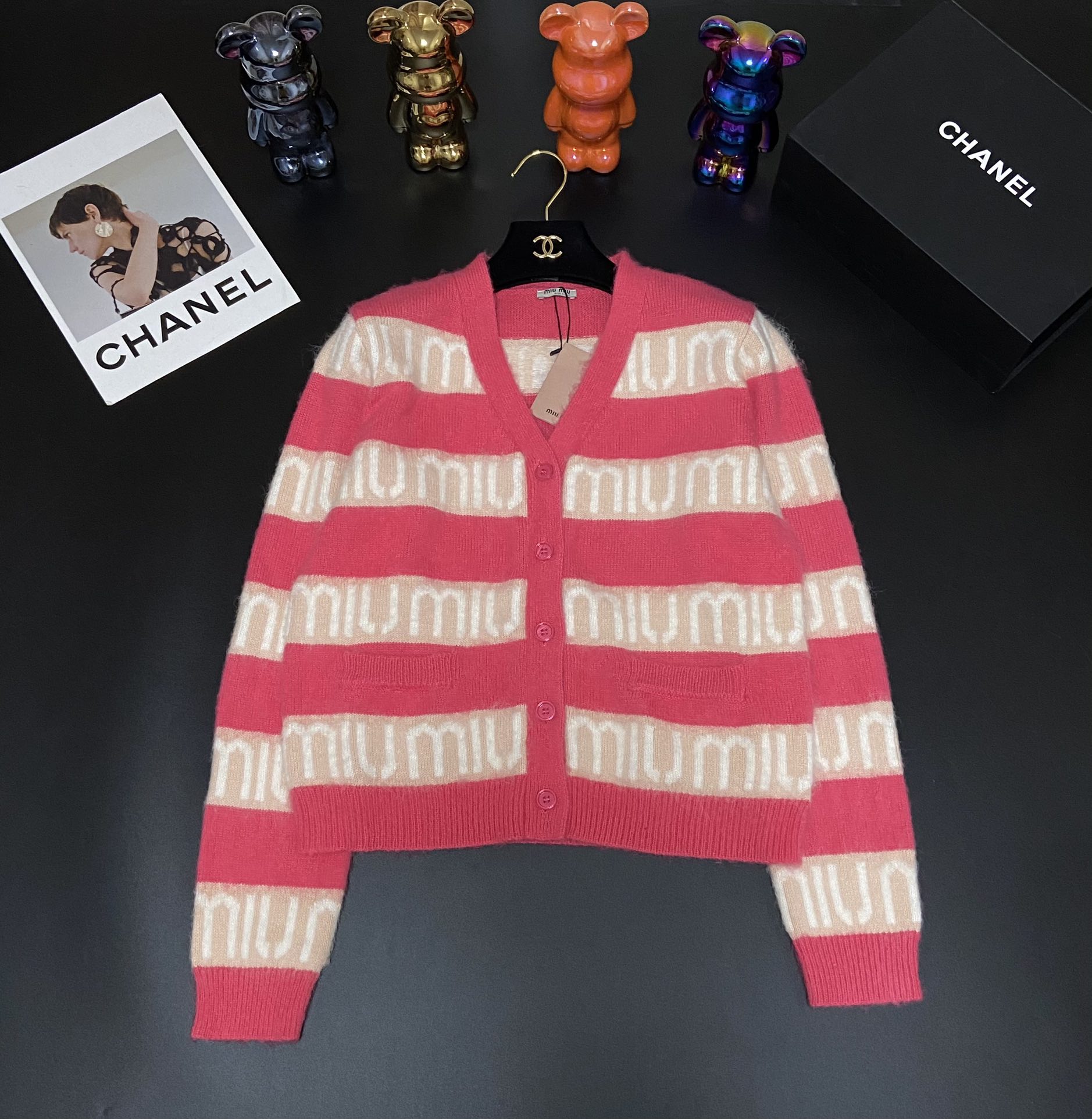 MIU MIU bump rose pink stripe letter jacquard mohair